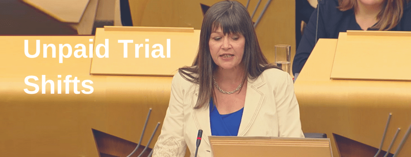 Clare took part in a Scottish Parliament debate on unpaid trial shifts. Her SNP colleague, Stewart McDonald MP, has launched a Bill at Westminster to outlaw their use.